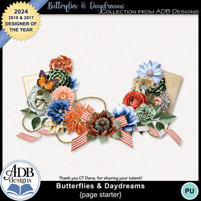The traditional elements include: buttons & charms, ribbons, frames, feathers, birdhouses, lots of flowers and foliage and, of course, a large variety of bluejays! The color palette is beautiful - blues (baby, sky, navy), golds (from pale buttercup to deep metallic gold), moss greens, chocolate browns, and grays from pale dove through deep charcoal.
